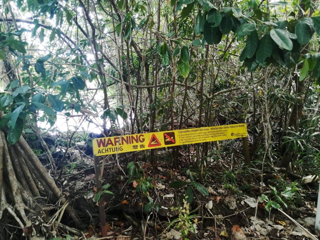 Quand on avait préparer le voyage, on avait discuté du fait que certains endroits seraient trop dangereux pour la baignade. Rester raisonnable face à une eau pareille, sur une plage déserte, c’est vraiment difficile. Mais on a bien fait, car en longeant la plage jusqu’au bout sur notre droite, nous sommes arrivés aux mangroves. Je me suis alors rappelé notre amie Fred qui nous avait dit « la plage est superbe, mais avec les grandes pancartes attention aux crocodiles, toute seule, je n’étais pas rassurée ». Et on a fini par en voir une, de ces pancartes. Tout de suite, contrairement aux méduses qui ne nous ont inquiété que légèrement vu la saison, les crocodiles marins nous ont un peu plus impressionnés. Je ne sais pas pourquoi chaque chemin menant à la plage n’a pas les mêmes indications. Heureusement pour nous, les crocos n’ont pas eu envie de nous rendre visite lors de nos balades.
