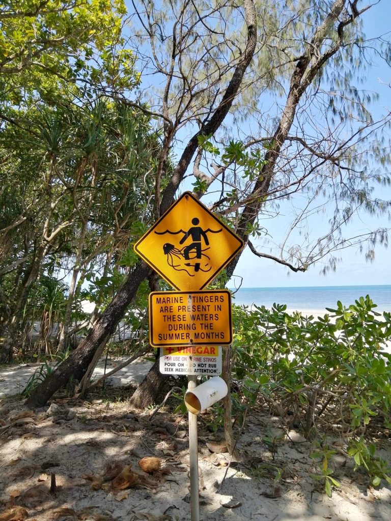 On a pu profiter de cette magnifique plage pendant 2 jours (deux demie journée et une complète). L’eau est tellement bonne ! J’aurais presque envie de dire chaude, et ne pas s’y baigner a été frustrant. A l’accueil on nous a bien précisé de ne surtout pas s’y baigner. À l’entrée de la plage, une pancarte indique la présence de méduses. Comme un peu partout au Queensland, étant en octobre, ce n’est pas encore vraiment la période. Alors on s’est quand même laissé tenter à y mettre les pieds, les chevilles… et presque les genoux. En se disant que ce n’est pas si grave.