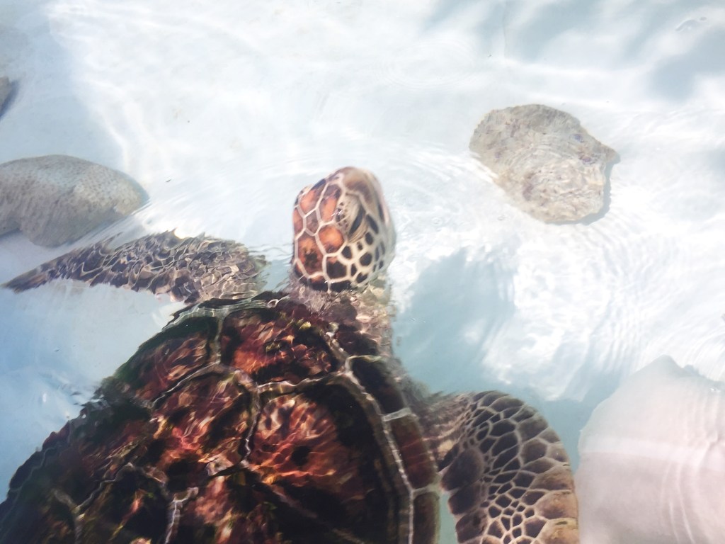 La première tortue est dans la piscine la plus éloignée et ne peut pas être vue, dans un premier temps pour son bien-être, car elle est très craintive. Dans un second temps pour une raison évidente : elle est passée sous l’hélice d’un bateau.